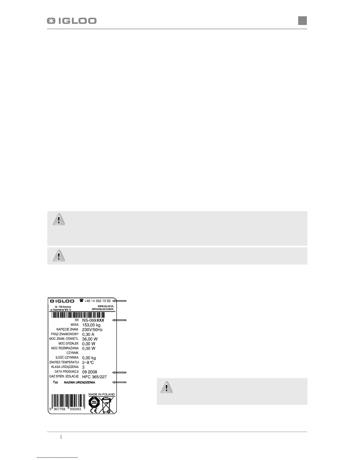 contact Technical Service of the Igloo company, stating the data from the data plate Fig.9 (p.16):
