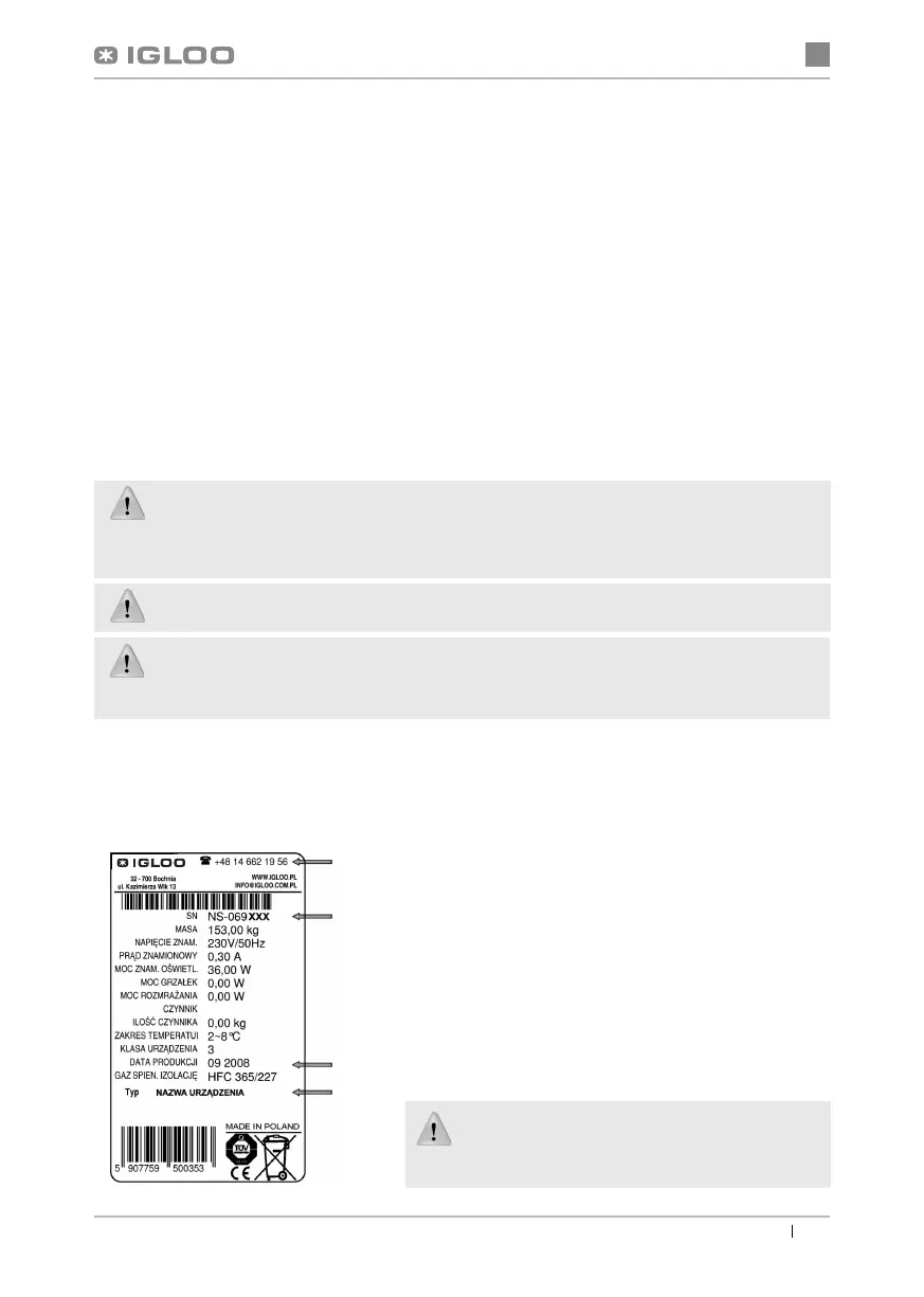 prawidłowo, należy skontaktować się z Serwisem Technicznym fi rmy Igloo, podając dane z tabliczki znamionowej Rys.12