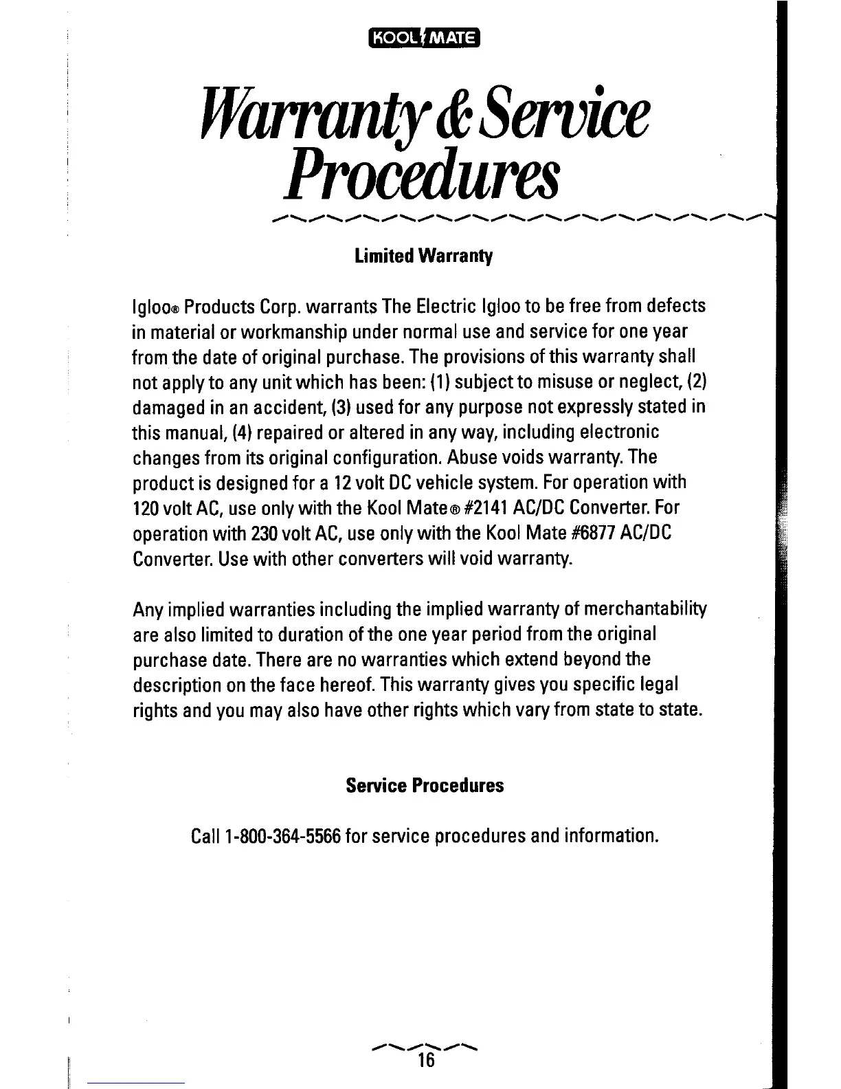 Igloo KoolMate - Warranty & Service Procedures; Limited Warranty Terms; Service and Information Contact