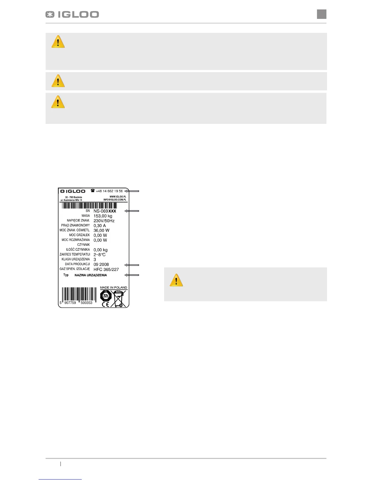 prawidłowo, należy skontaktować się z Serwisem Technicznym rmy Igloo, podając dane z tabliczki znamionowej Rys.10