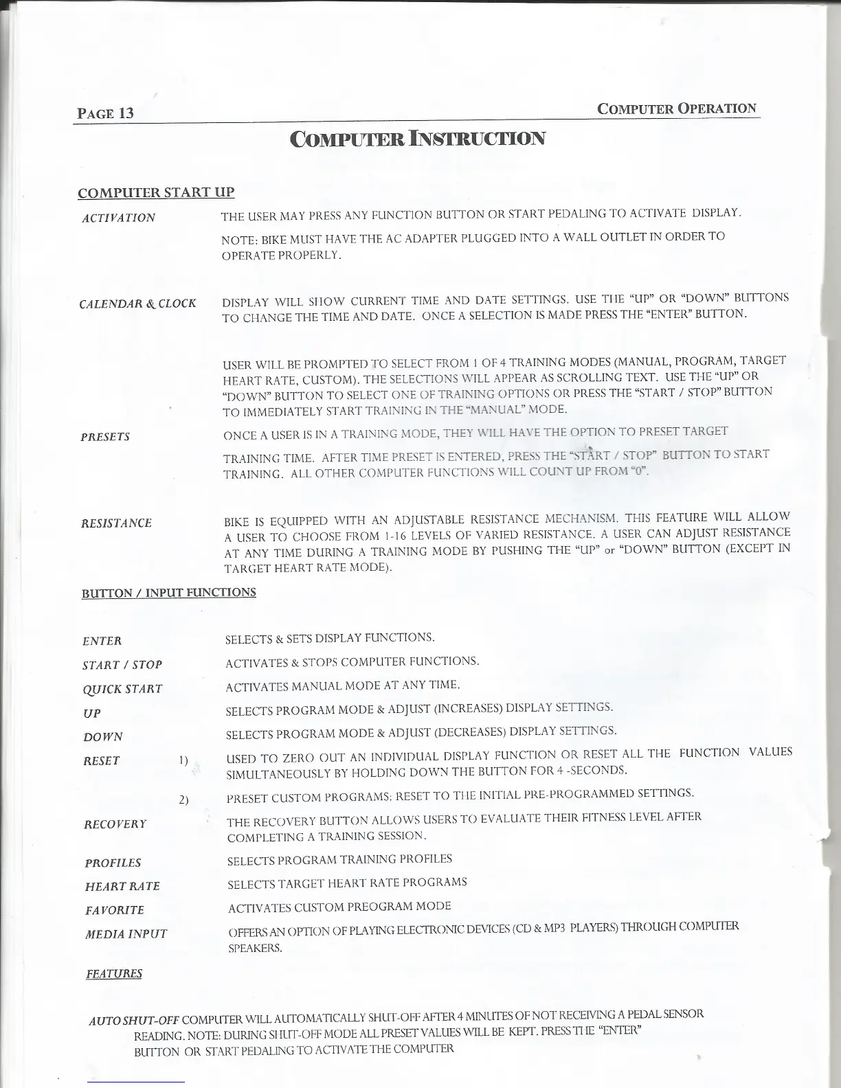 Ignite 1746 - Computer Instruction; Computer Start Up; Presets; Resistance Adjustment