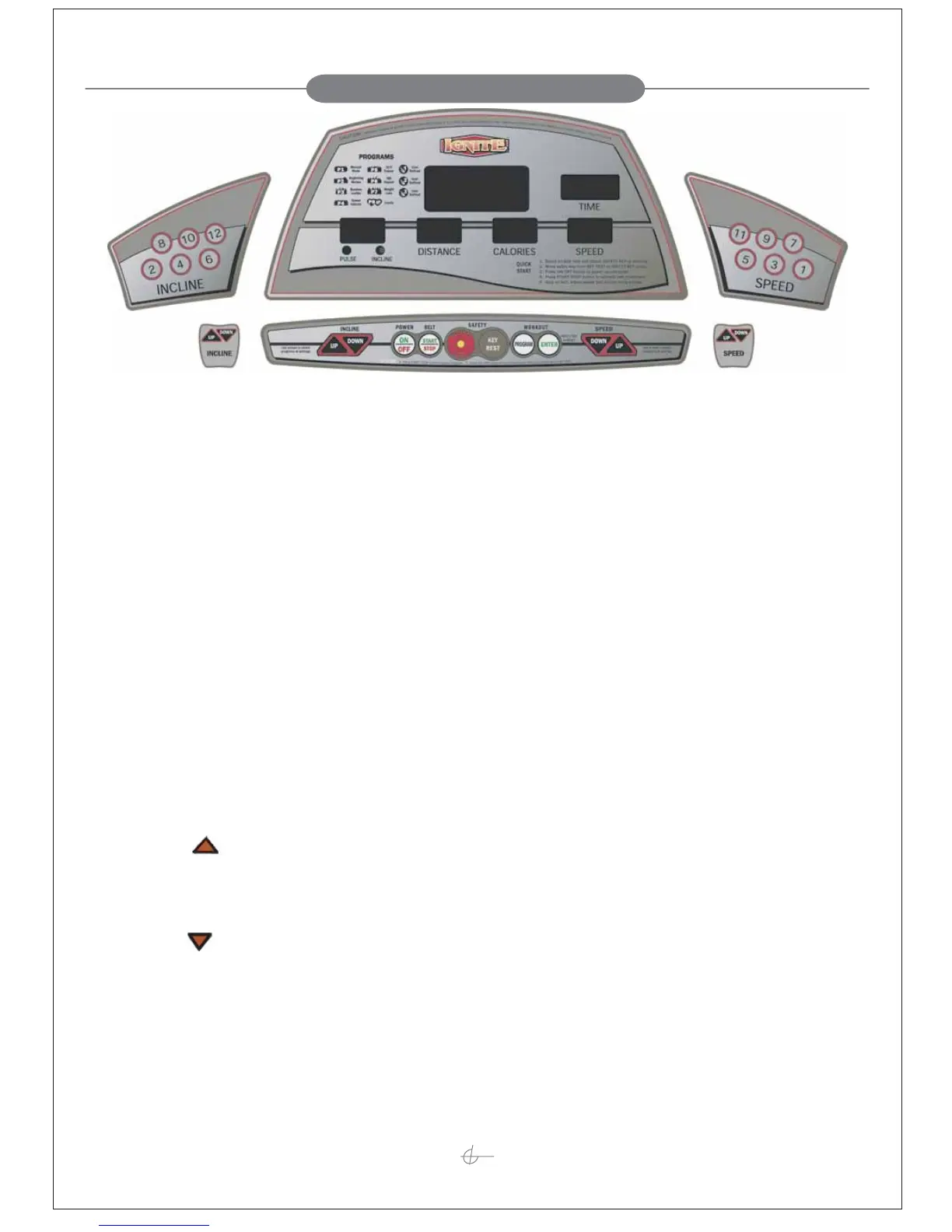Decreases the incline level in the range from 1 to 16 shown in the PULSE/INCLINE Display.