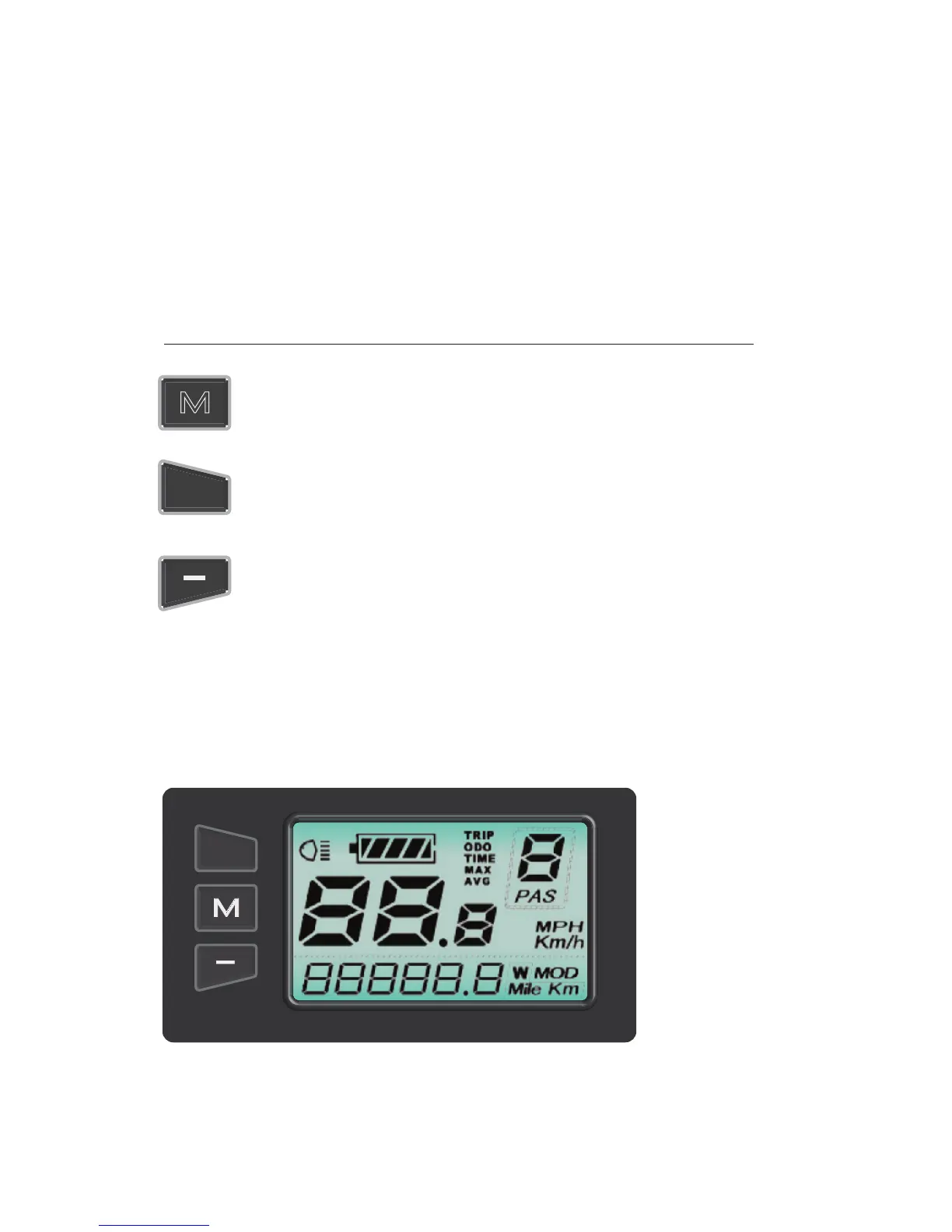 ‘MODE’ : Powers ebike ON/OFF, Toggles through display modes