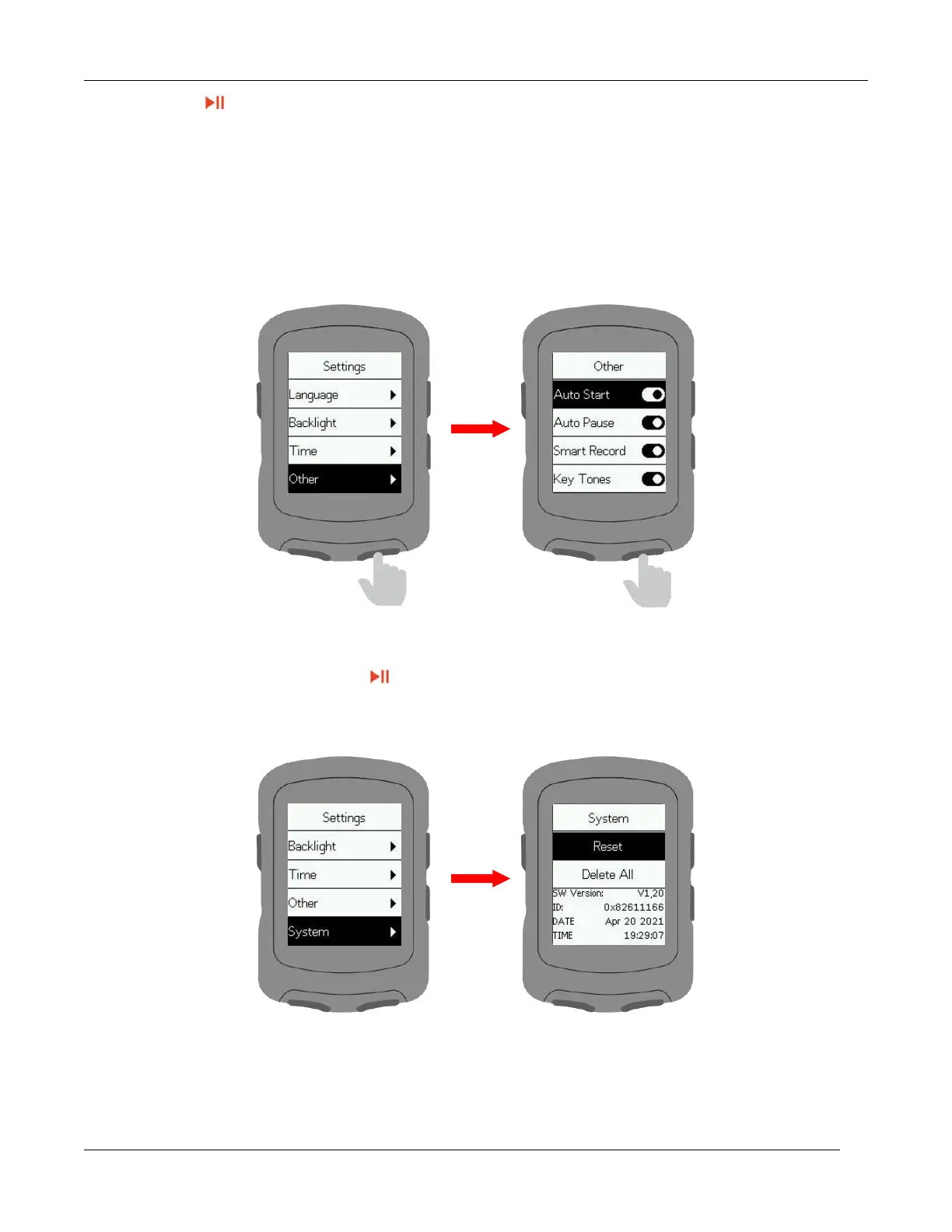 Press to turn on/off Auto Start, Auto Pause, Smart Record, Key Tones, Battery