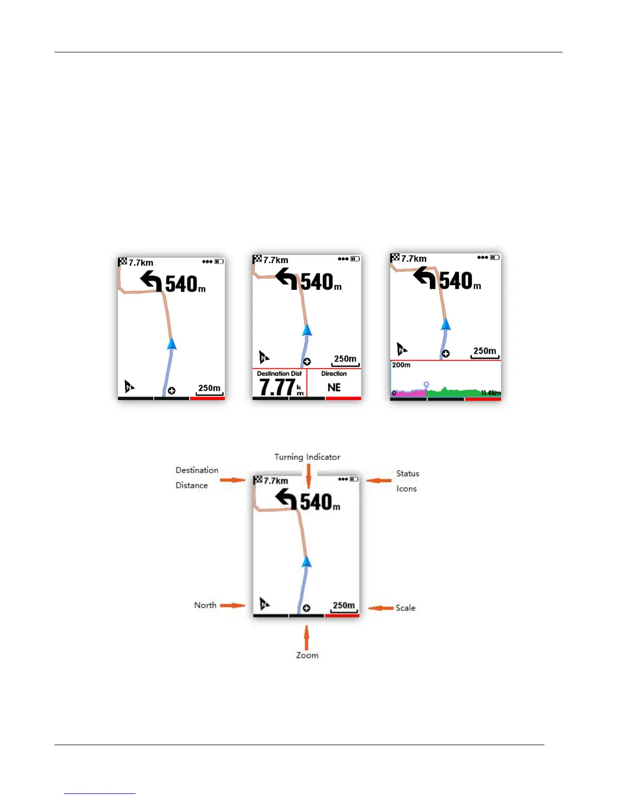 When Turning indicator On, device will indicate the turning direction and distance with arrow and