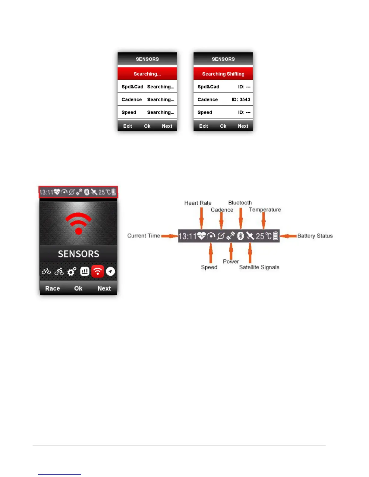 When sensors are connected, the indicator icons will be shown in the upper screen as below: