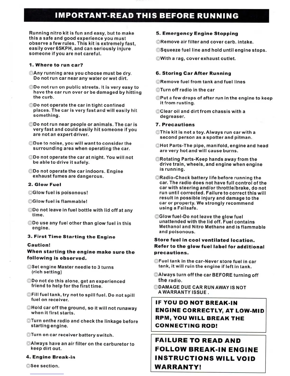 IGT8 GT PRO - Important Safety and Operation Guidelines; Where to Run Your Car; First Time Starting the Engine; Engine Break-in Procedure