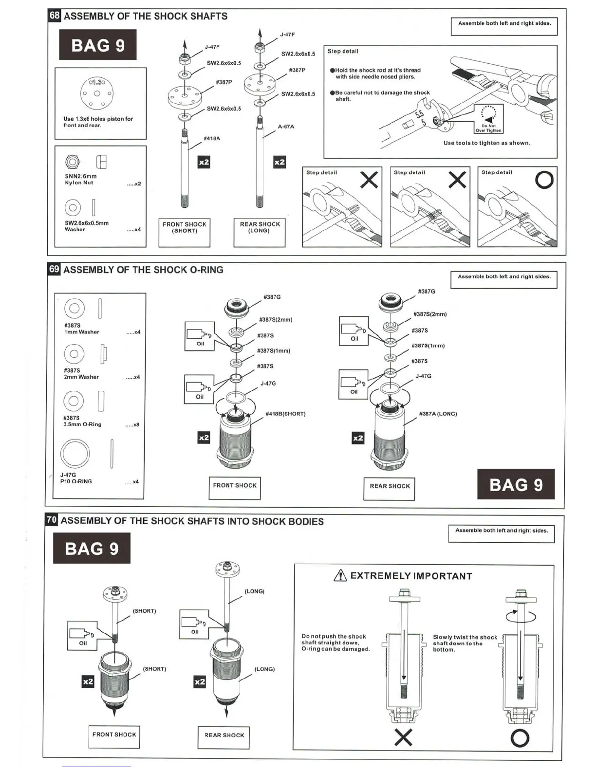 IGT8 GT PRO - Assembly of the Shock Shafts; Assembly of the Shock O-Ring; Assembly of the Shock Shafts into Shock Bodies
