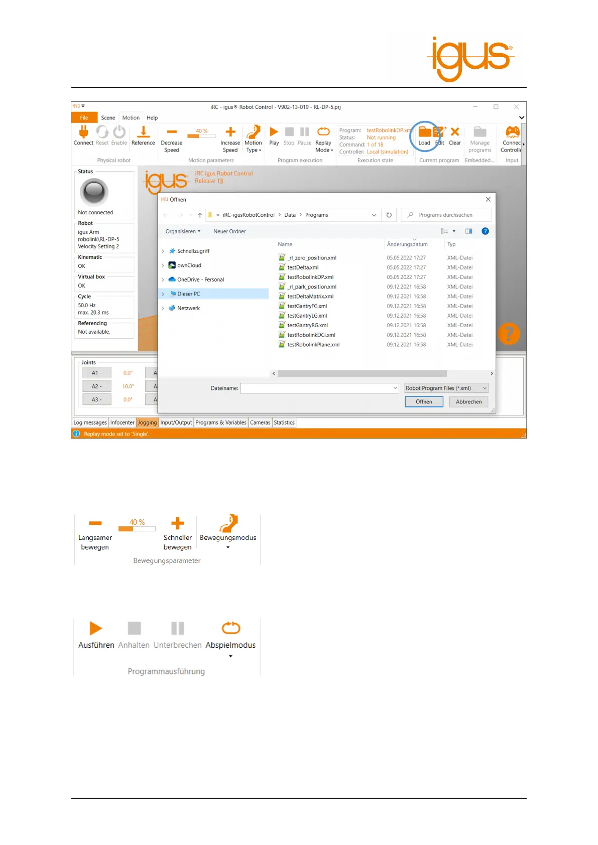• After pressing the "Pause" icon, the robot can continue with the program by clicking the