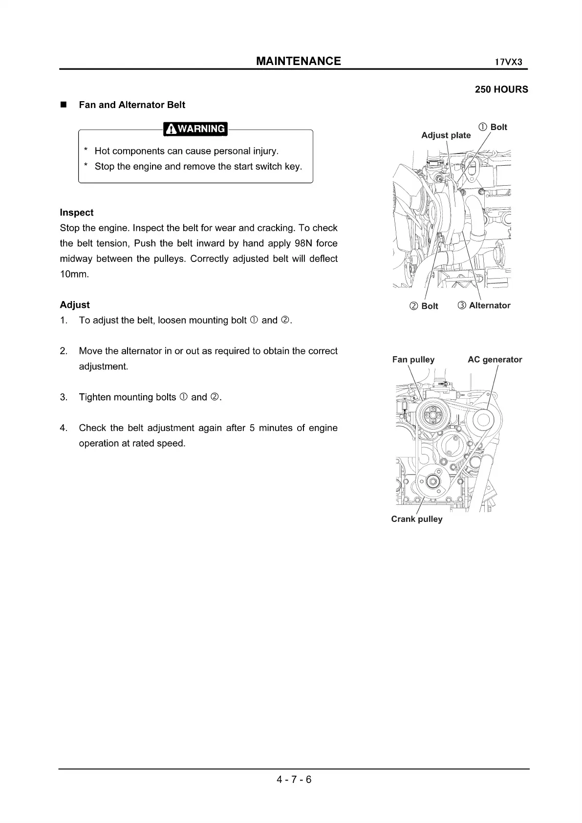 Stop the engine. Inspect the belt for wear and cracking. To check