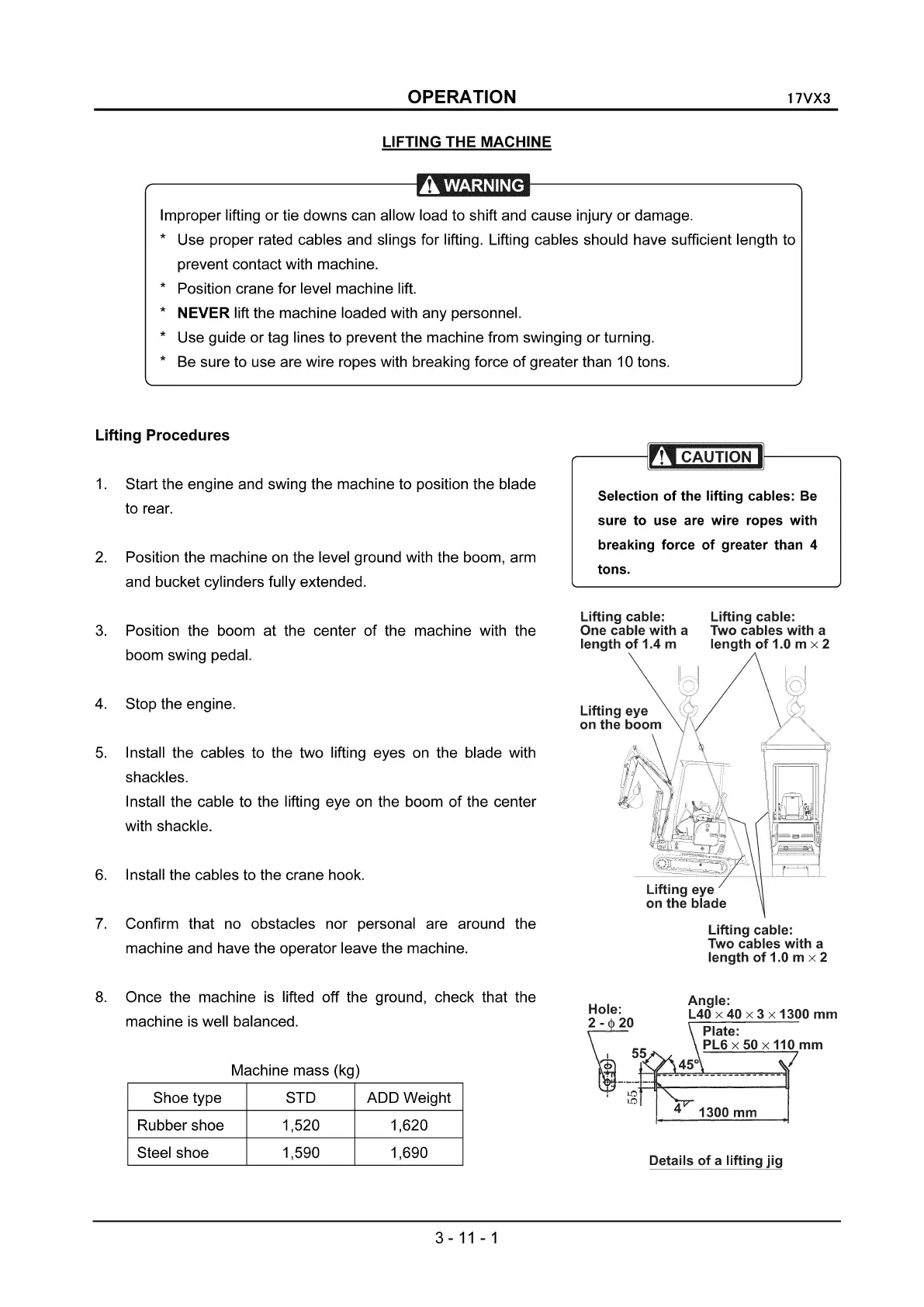* Use proper rated cables and slings for lifting. Lifting cables should have sufficient length to
