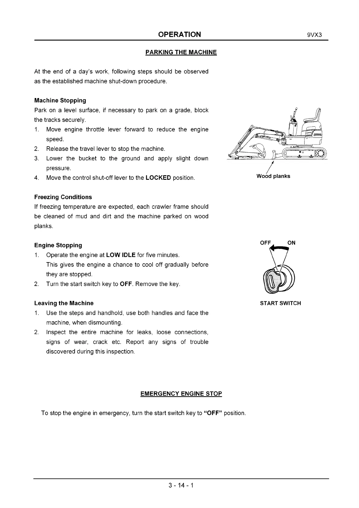 To stop the engine in emergency, turn the start switch key to “OFF” position.