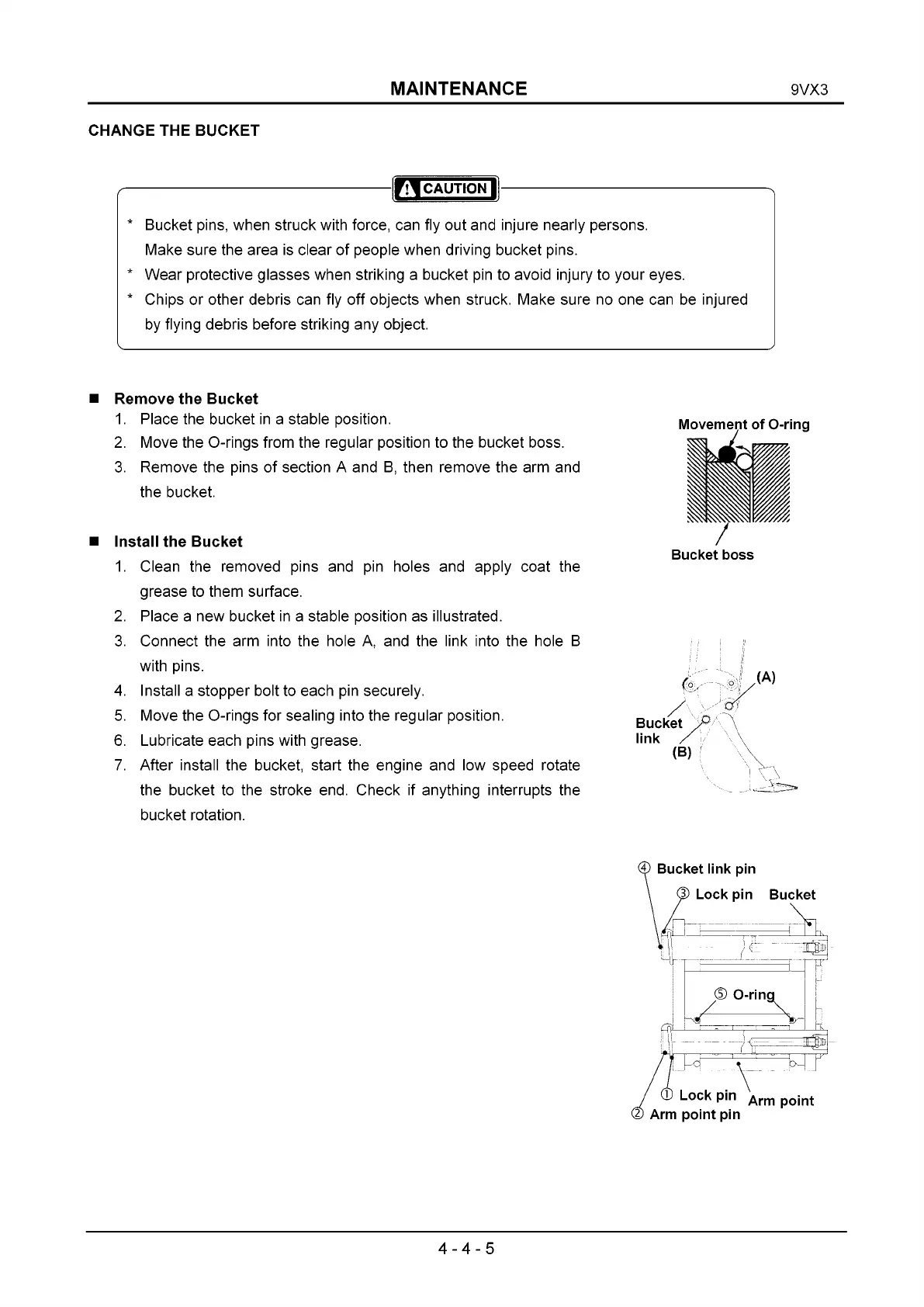 * Bucket pins, when struck with force, can fly out and injure nearly persons.