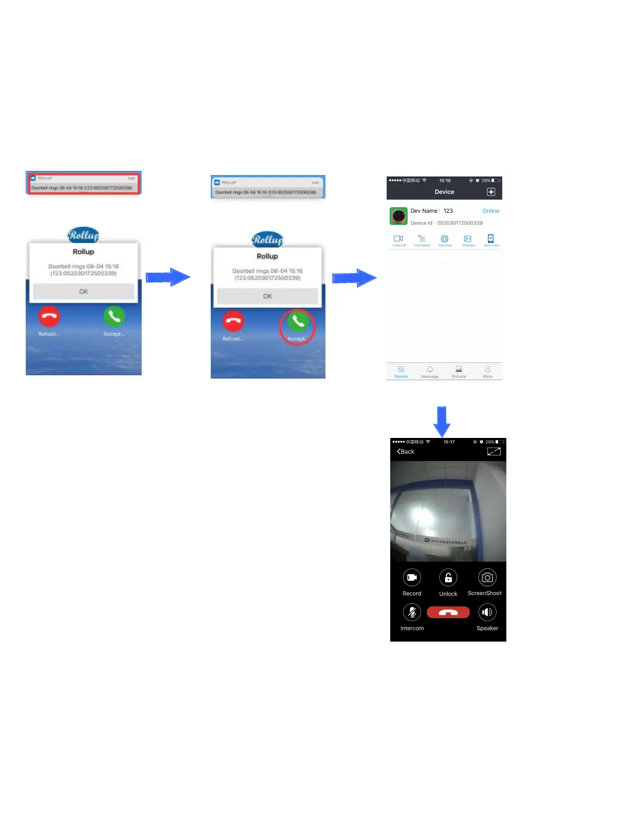 Notes: When you are having video talk with door visitors, you could press the smart phone screen and click Start record to