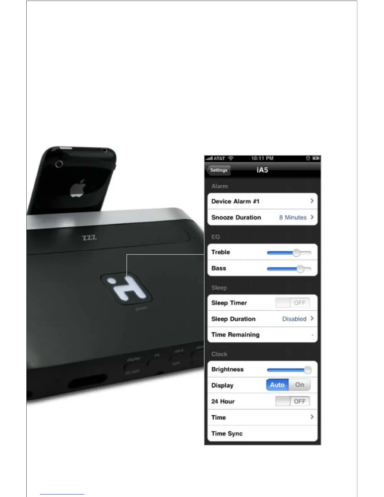device settings for clock syncing, eq, and more...
