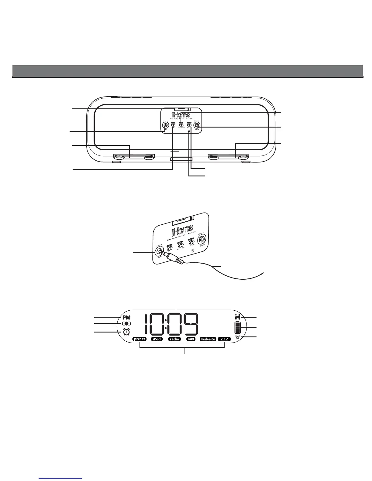 Preset / iPod / Radio / AUX / Wake-to / Sleep indicators