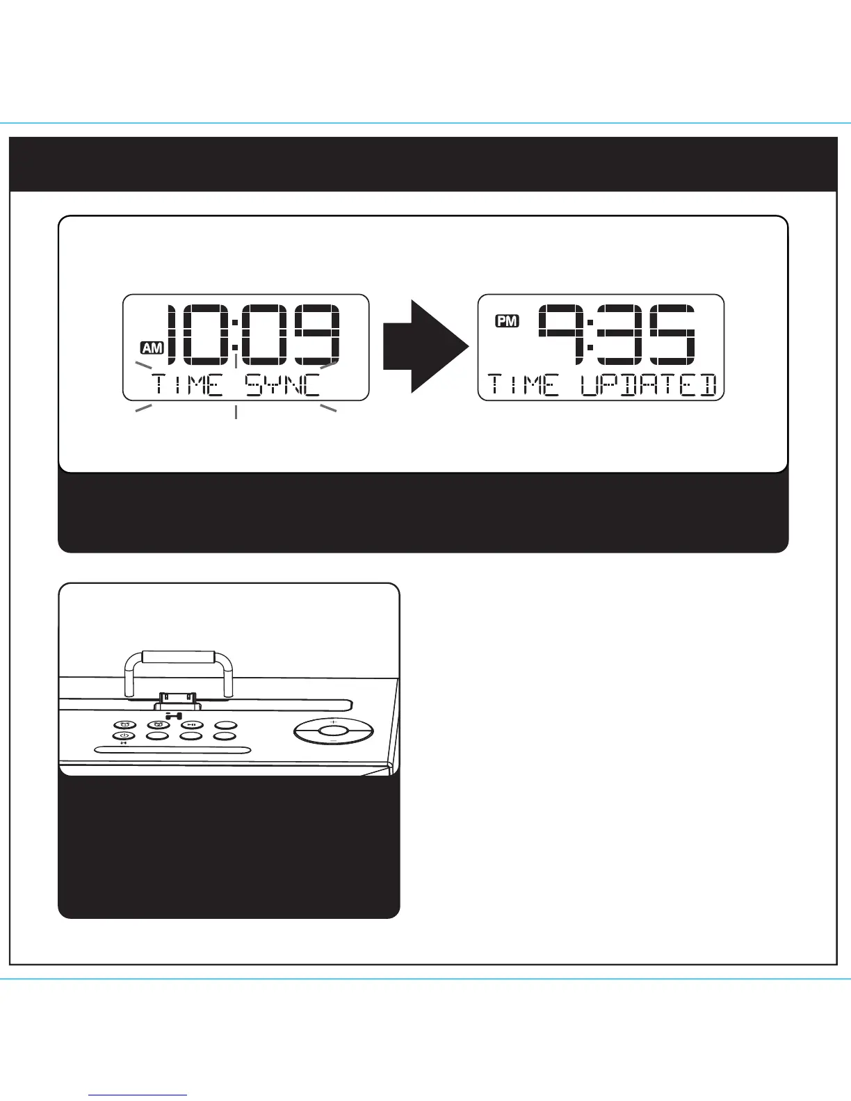 Dock your iPad, iPhone or iPod (see step 3). Press and release the Time Sync Button located