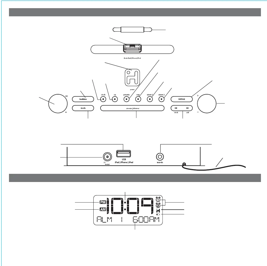 Alarm Time /EQ/ Mode Display (Dock/USB Dock/FM/Aux-in)