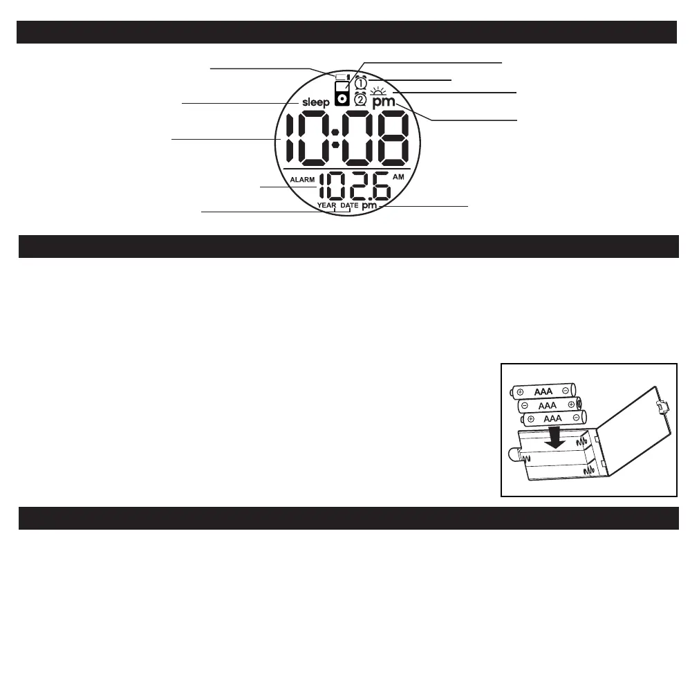 The unit uses 3 AAA batteries (not included) for backup to provide continuous alarm operation and clock settings in the event
