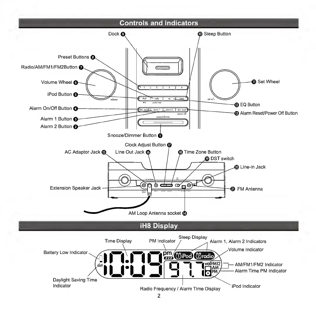 iHome iH8 - Controls and Display Overview; Unit Controls Identification; iH8 Display Indicators