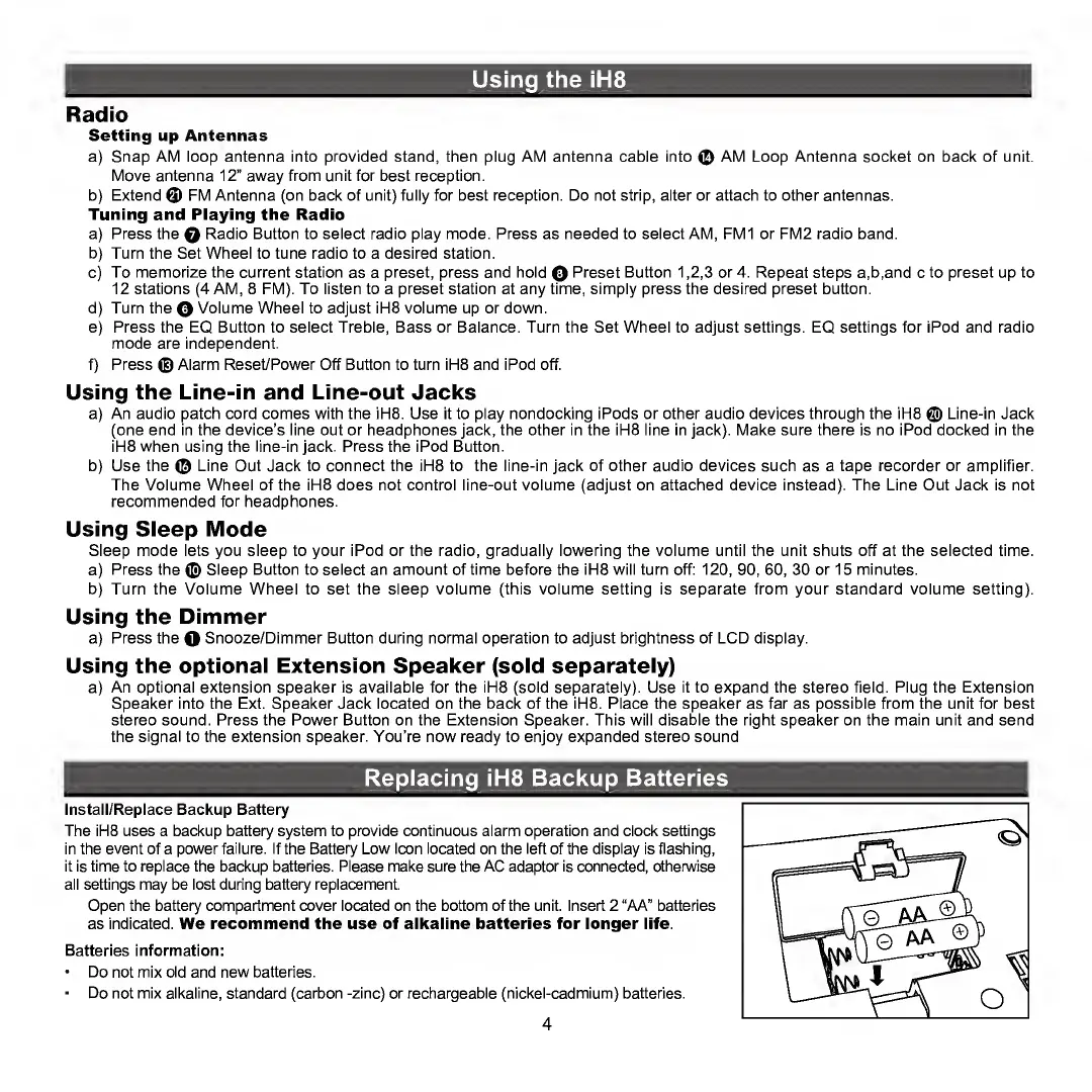 iHome iH8 - Radio Operation; Radio Antenna Setup; Tuning and Saving Stations; Audio Equalizer Settings