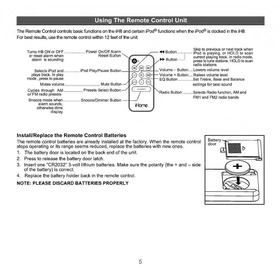 iHome iH8 - Remote Control Operation; Remote Control Functions; Remote Control Battery Replacement