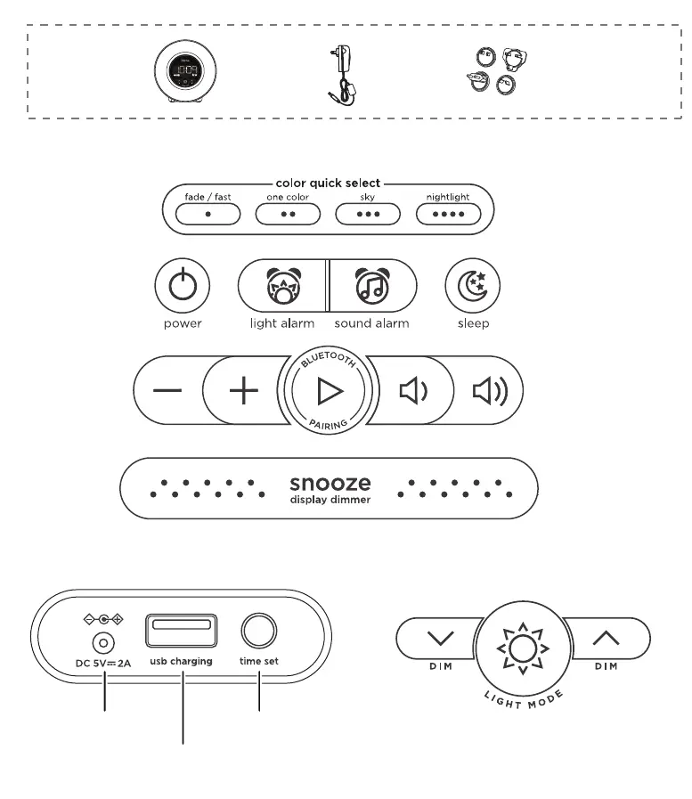 5. Press – or + Buttons to select a wake-to light mode: Dawn, Fade, Fast, Stop, Beat, Sky, or Nite.