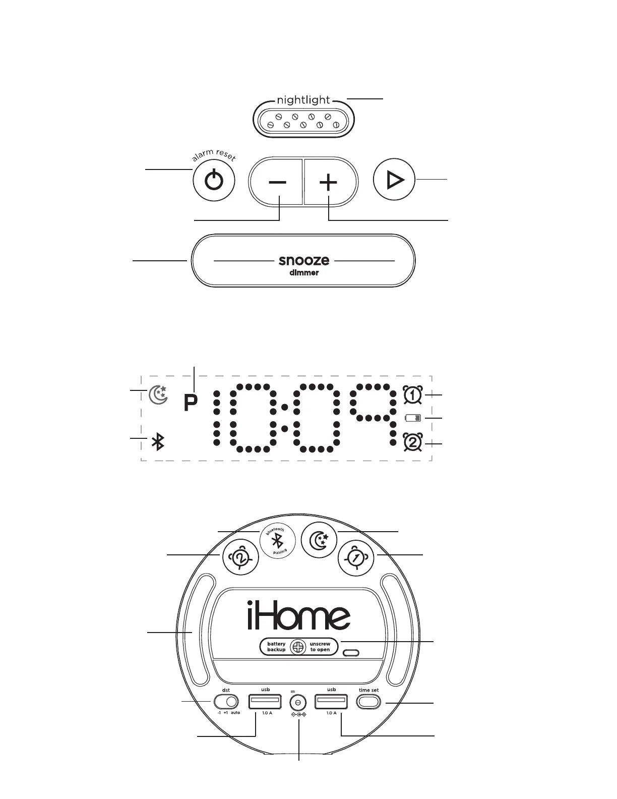 iHome POWERCLOCK iBT235 - Features and Controls Overview; Top Panel Controls; Clock Display Elements; Back Panel Ports and Buttons