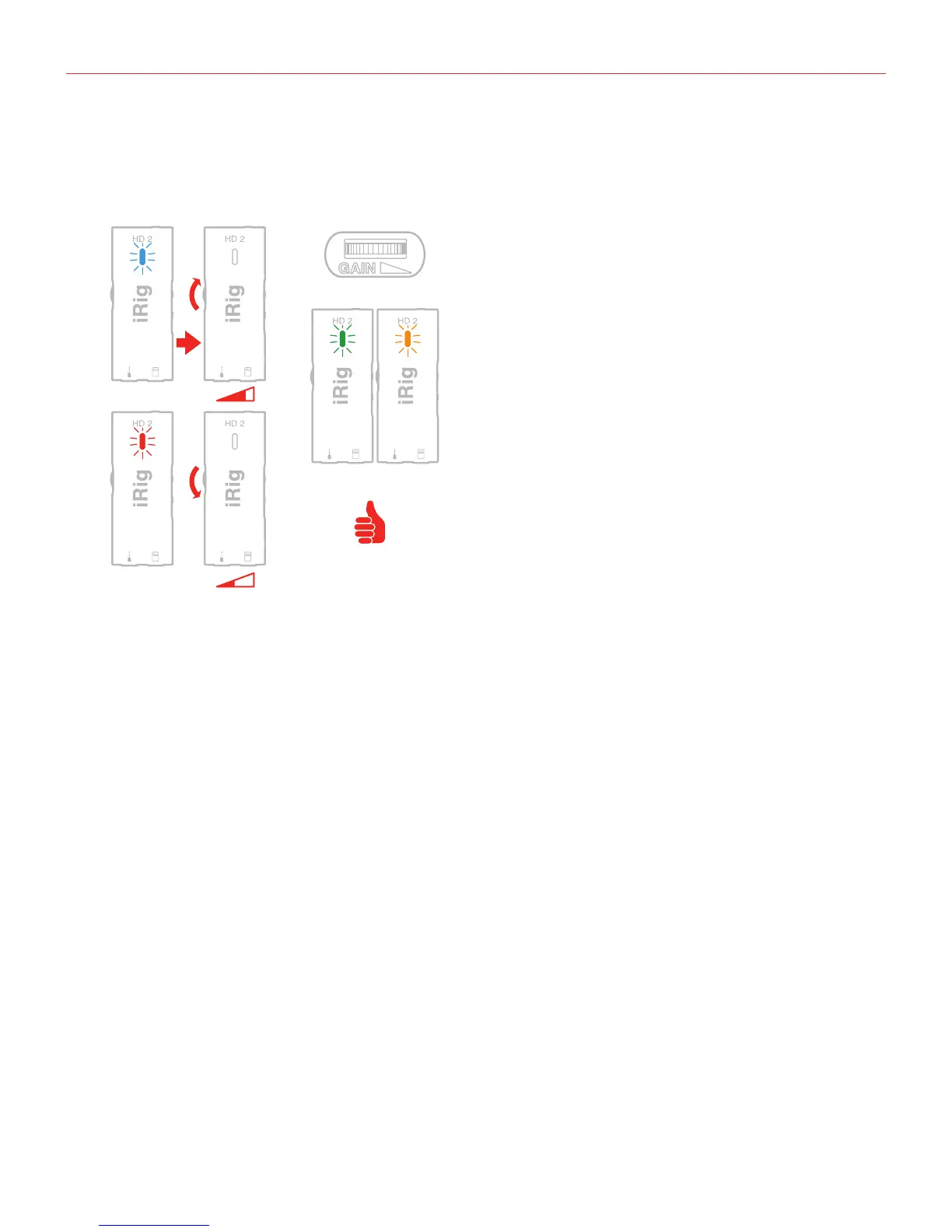 • If the LED is sometimes flashing RED you should decrease the iRig HD 2 input gain by rotating the GAIN
