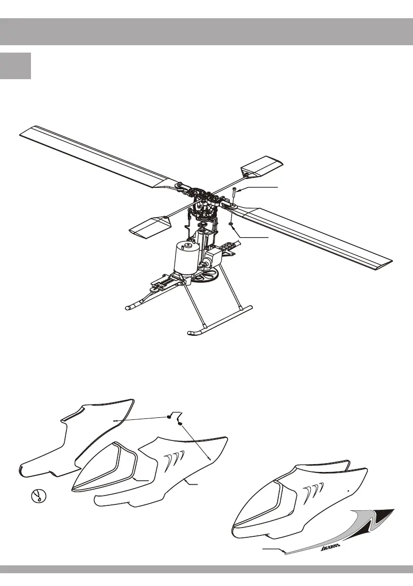 Fixez maintenant es pales principales dans les pieds de pales, avec les vis à tête creuse M2x12 Nr. 68216 et les