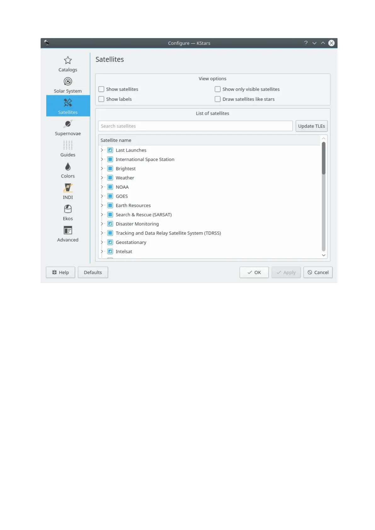 The Satellites page allows you to set the satellites view options. Firstly, you can