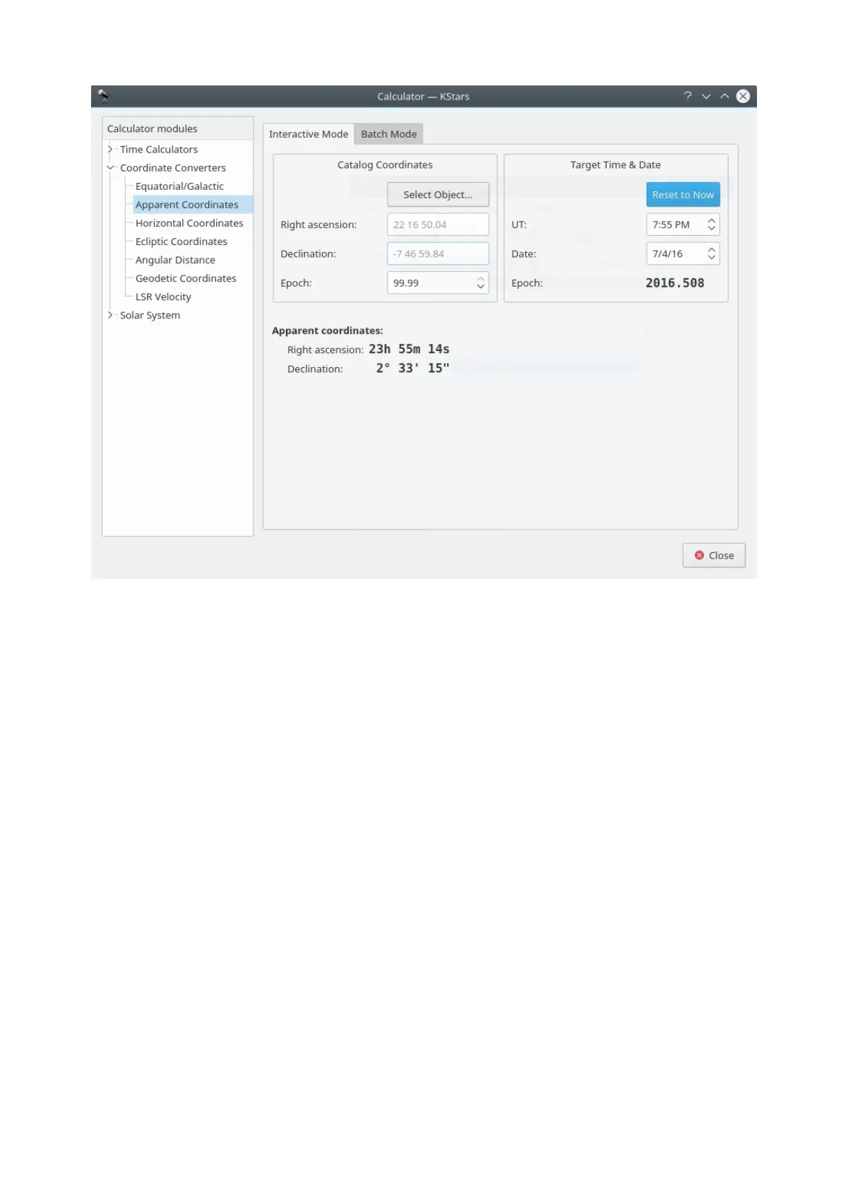 The Apparent Coordinates module converts the catalog coordinates of a point in