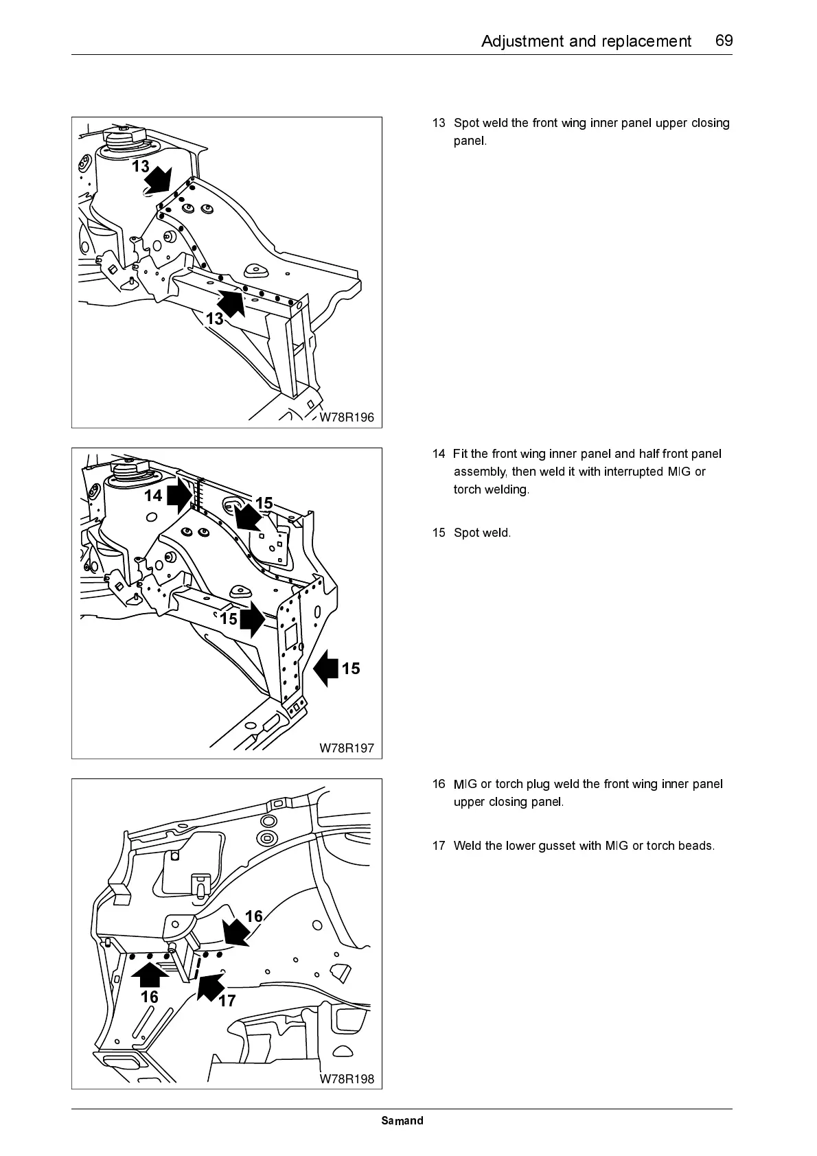 13 Spot weld the front wing inner panel upper closing
