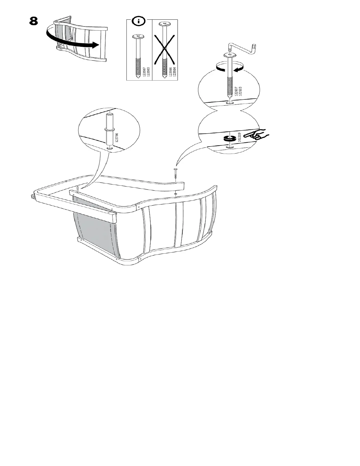 E. Insert short shank screw (#122607) through the hole in the leg, through the washer, and into