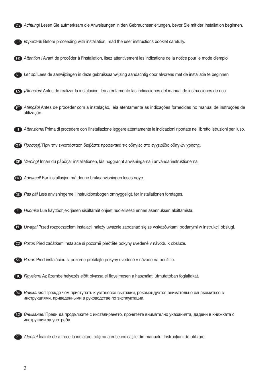 Achtung! Lesen Sie aufmerksam die Anweisungen in den Gebrauchsanleitungen, bevor Sie mit der Installation beginnen.