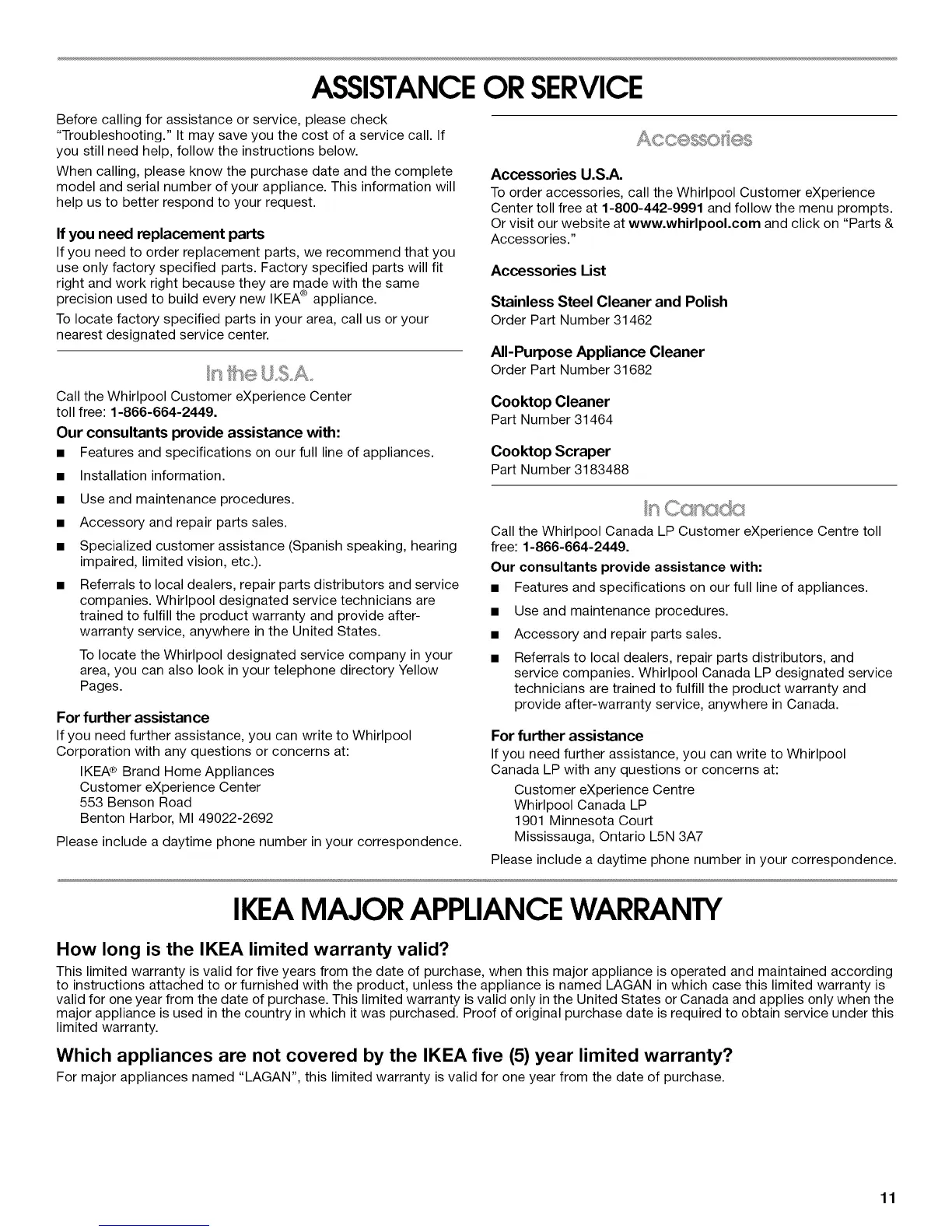 To order accessories, call the Whirlpool Customer eXperience