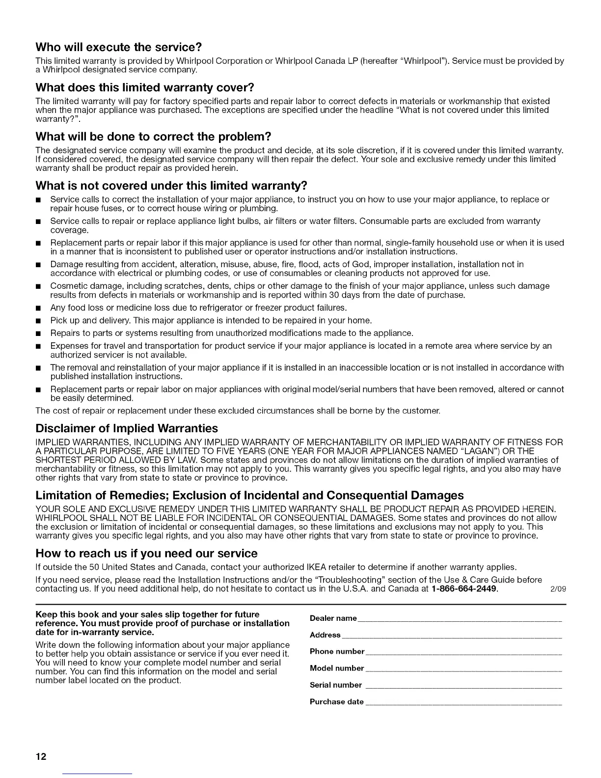This limited warranty is provided by Whirlpool Corporation or Whirlpool Canada LP (hereafter "Whirlpool"). Service must be provided by