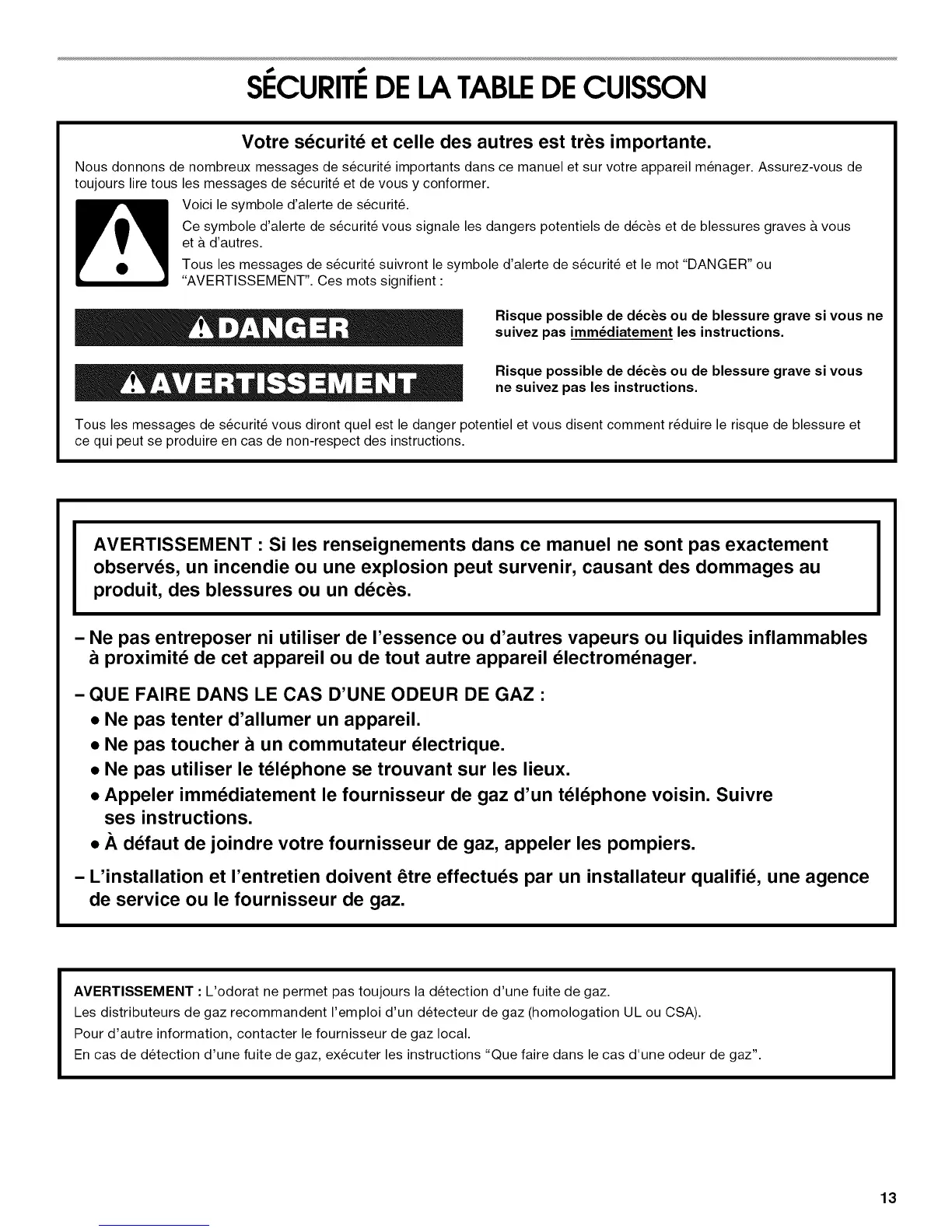 AVERTISSEMENT : L'odorat ne permet pas toujours la detection d'une fuite de gaz.