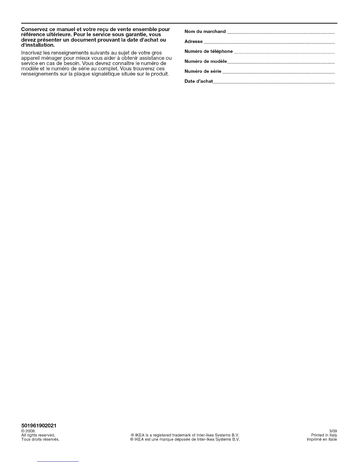 Conservez ce manuel et votre re_u de vente ensemble pour