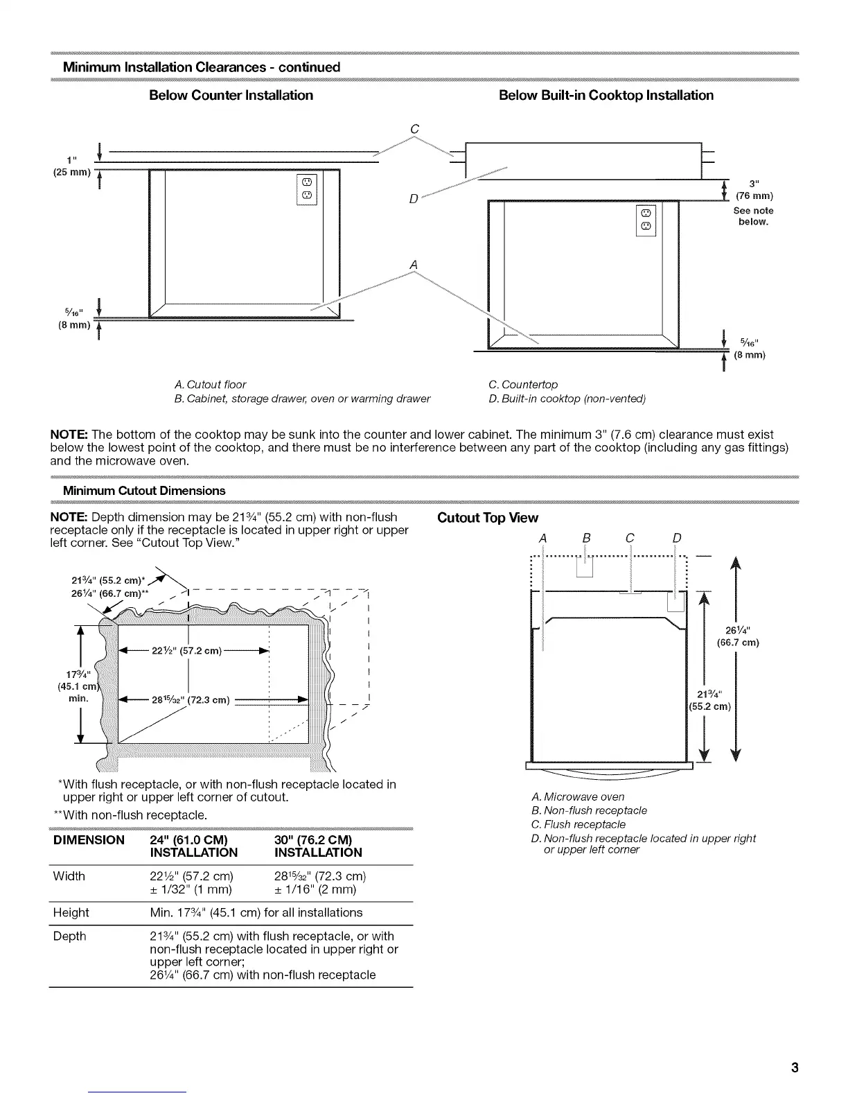 NOTE: The bottom of the cooktop may be sunk into the counter and lower cabinet. The minimum 3" (7.6 cm) clearance must exist