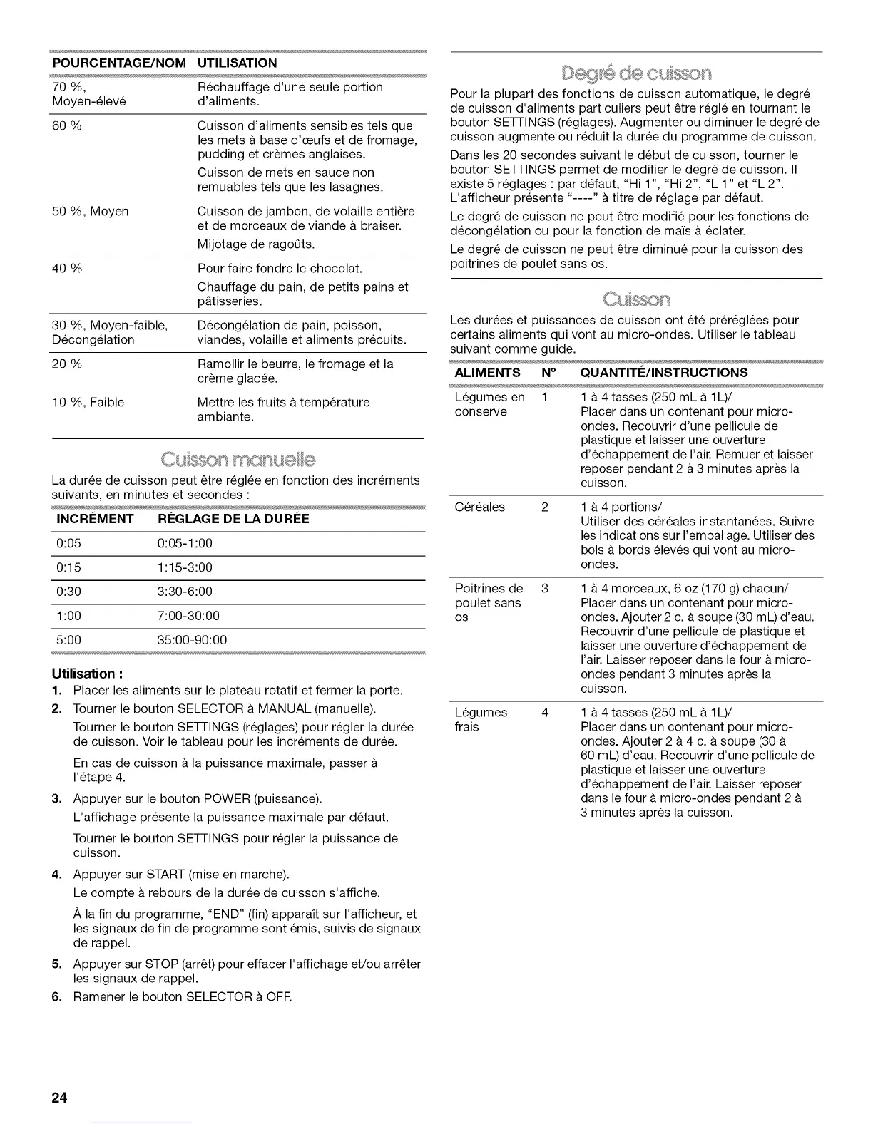de cuisson. Voir le tableau pour les increments de duree.