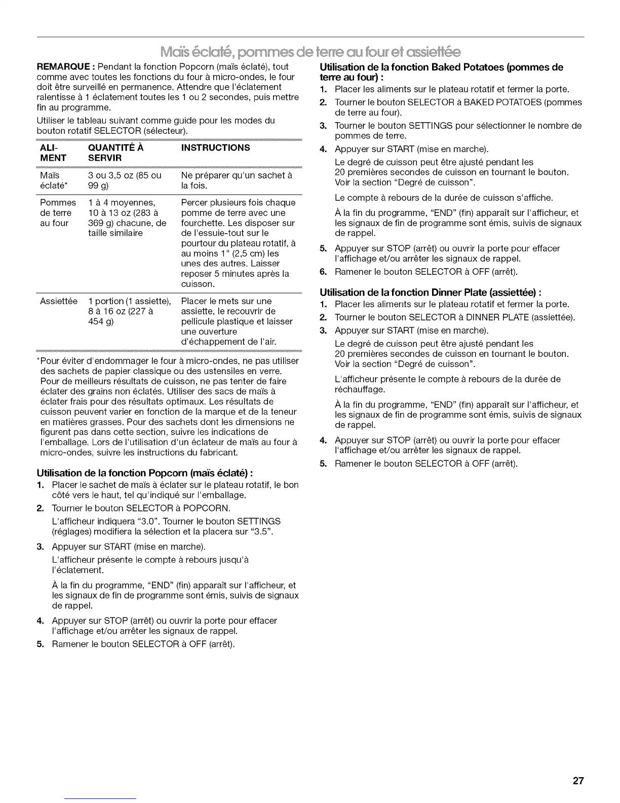 2. Tourner le bouton SELECTOR a BAKED POTATOES (pommes
