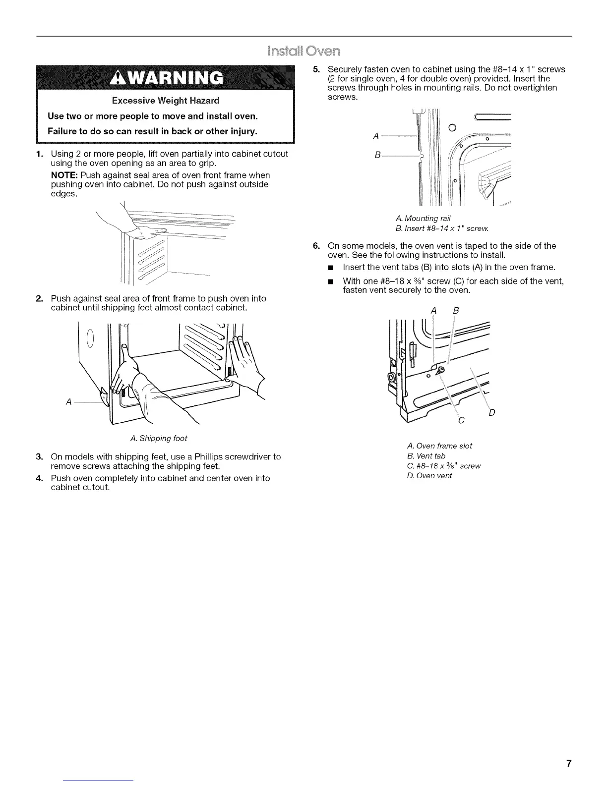 • Insert the vent tabs (B) into slots (A) in the oven frame.
