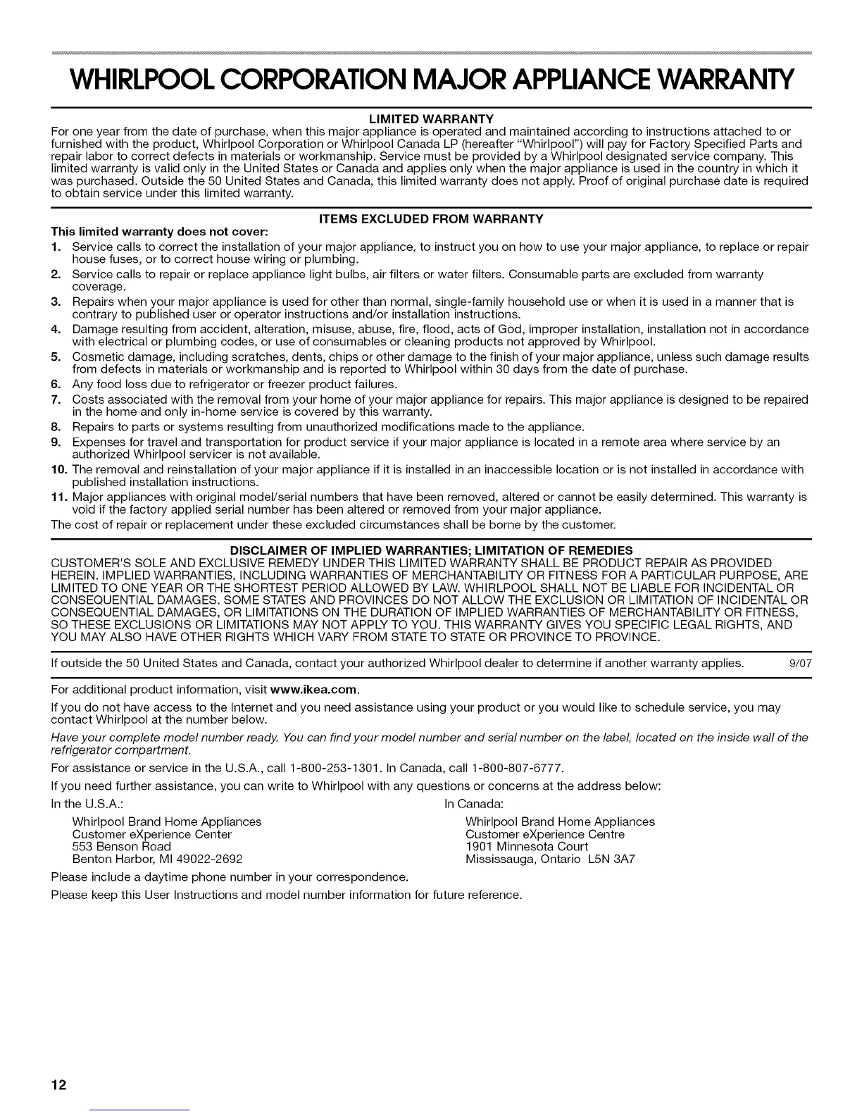 If outside the 50 United States and Canada, contact your authorized Whirlpool dealer to determine if another warranty applies. 9/07