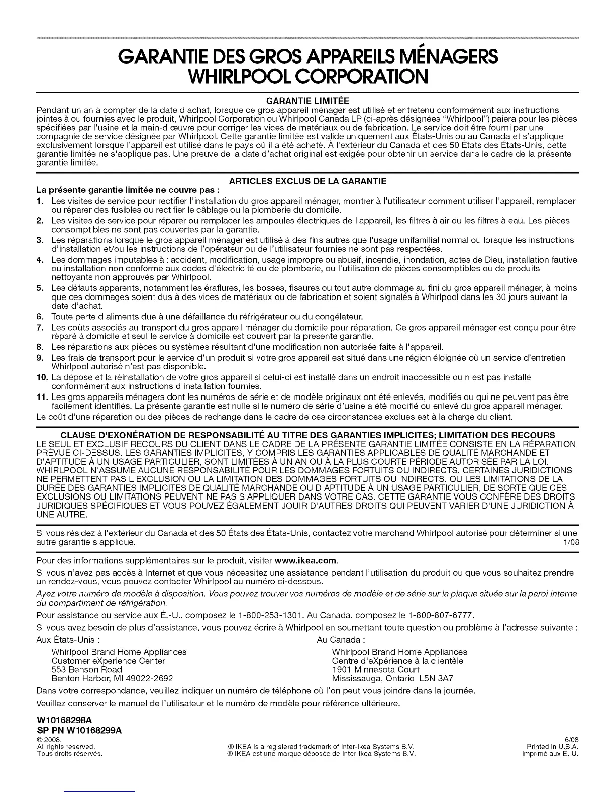 WHIRLPOOL N'ASSUME AUCUNE RESPONSABILIT# POUR LES DOMMAGES FORTUITS OU INDIRECTS. CERTAINES JURIDICTIONS