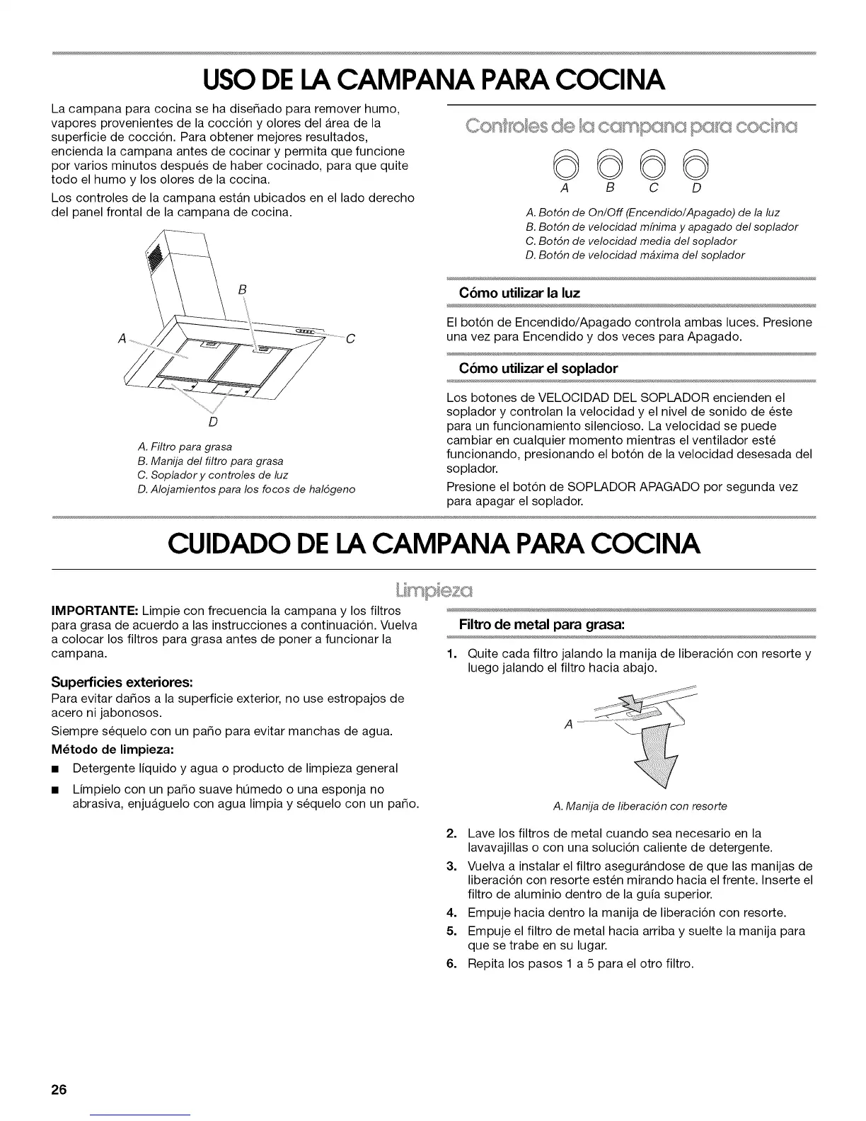 IMPORTANTE" Limpie con frecuencia la campana y los filtros