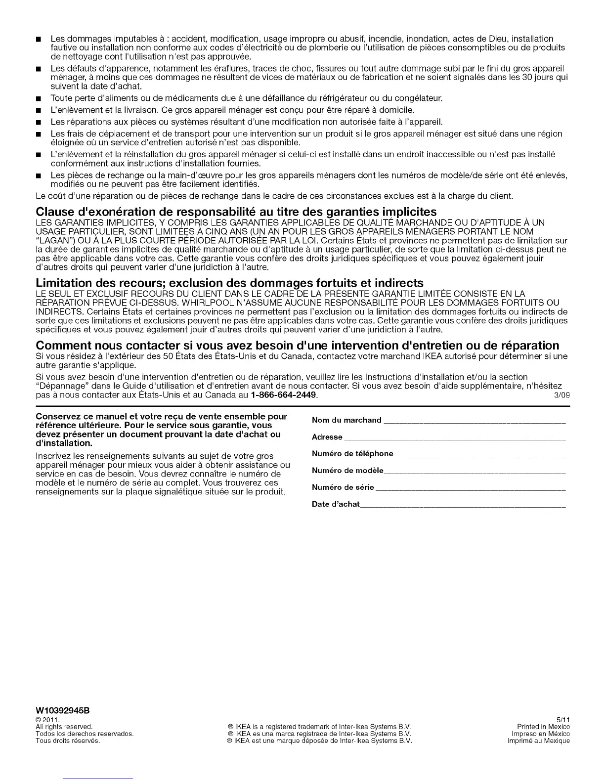 Si vous residez & I'exterieur des 50 €:tats des €:tats-Unis et du Canada, contactez votre marchand IKEA autorise pour determiner si une
