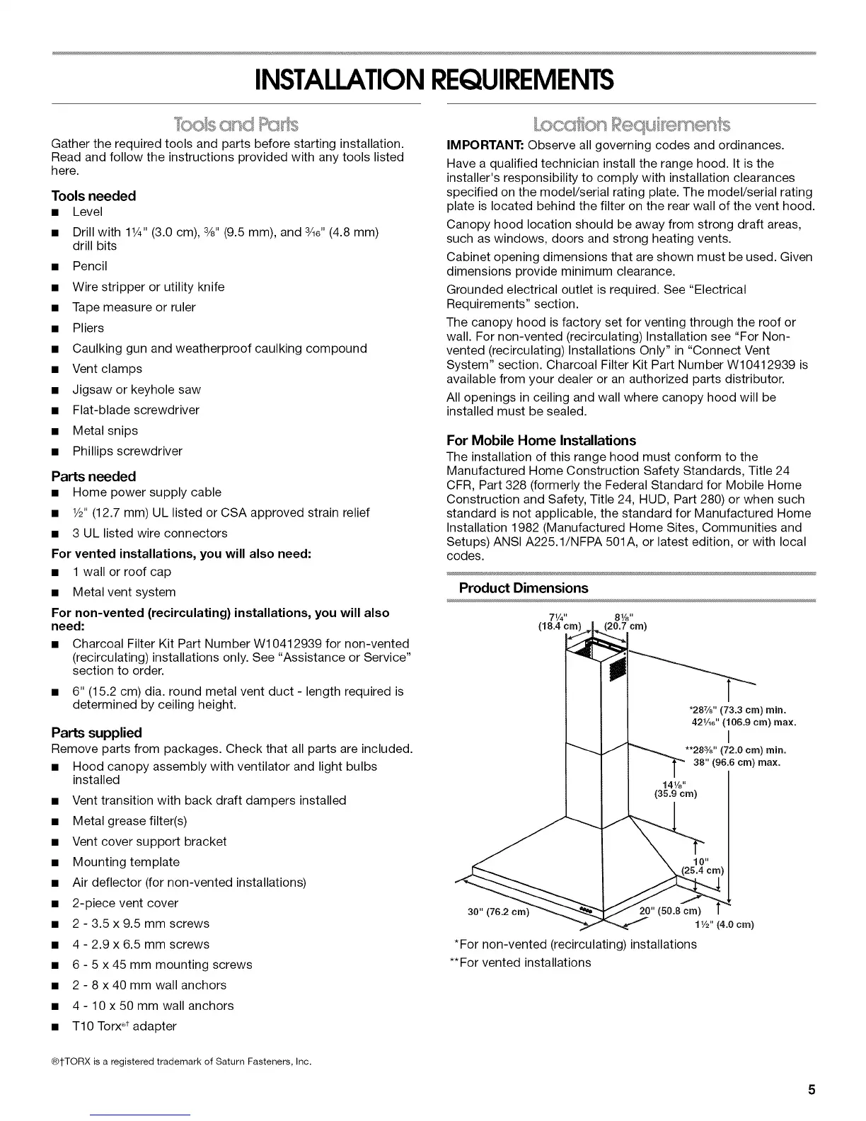 • Charcoal Filter Kit Part Number W10412939 for non-vented