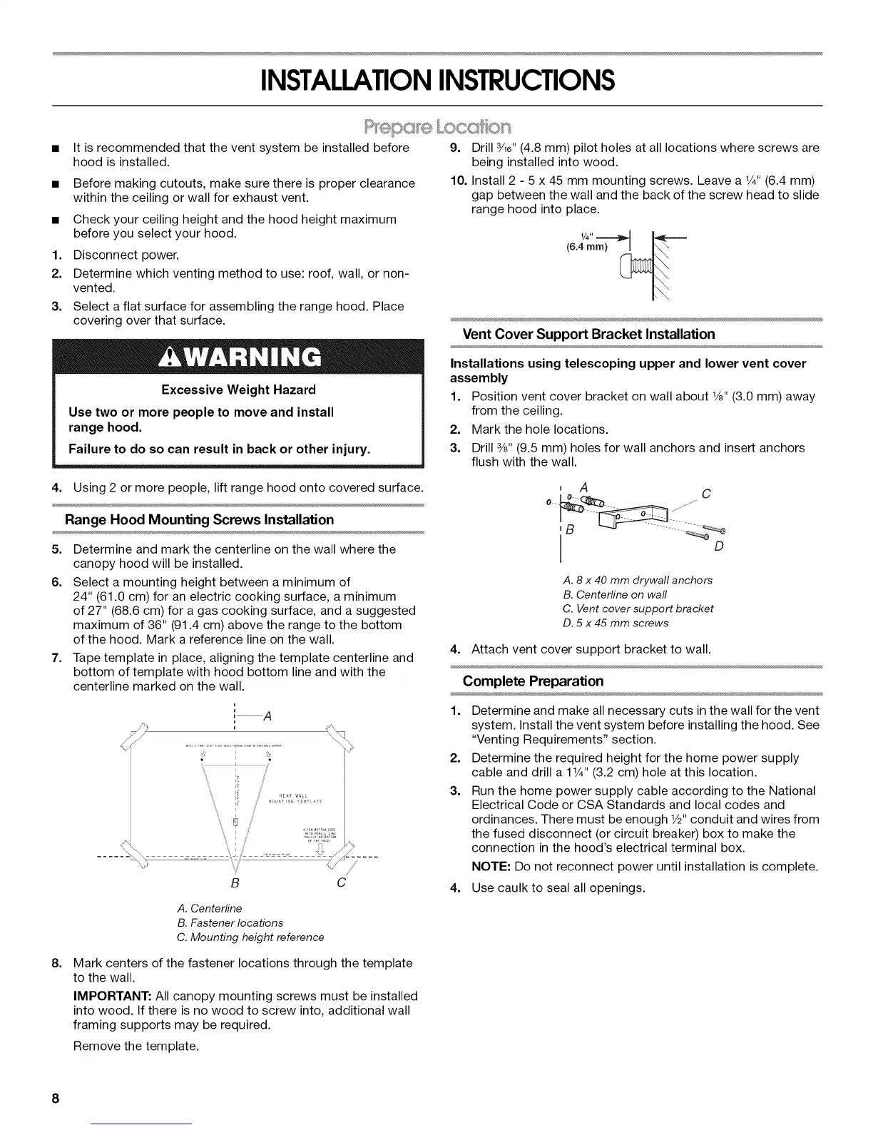 1. Position vent cover bracket on wall about 1/8"(3.0 mm) away