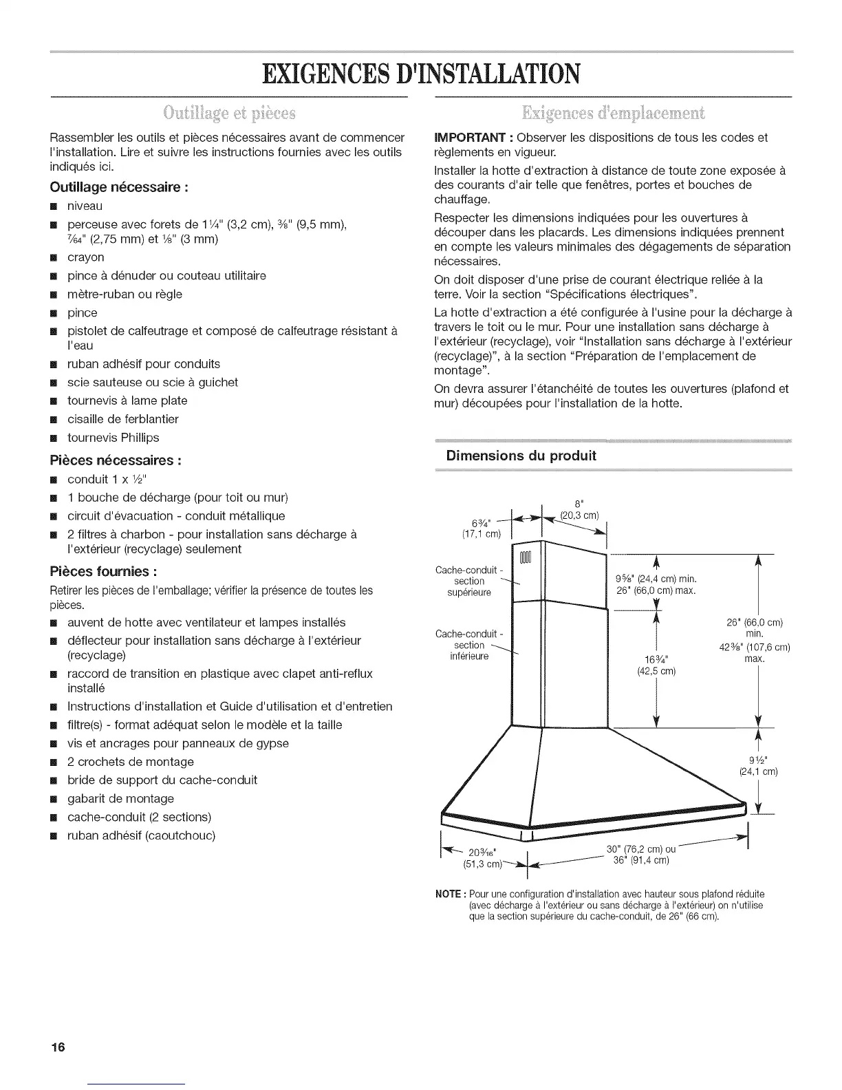 que la section superieure du cache-conduit, de 26" (66 cm).